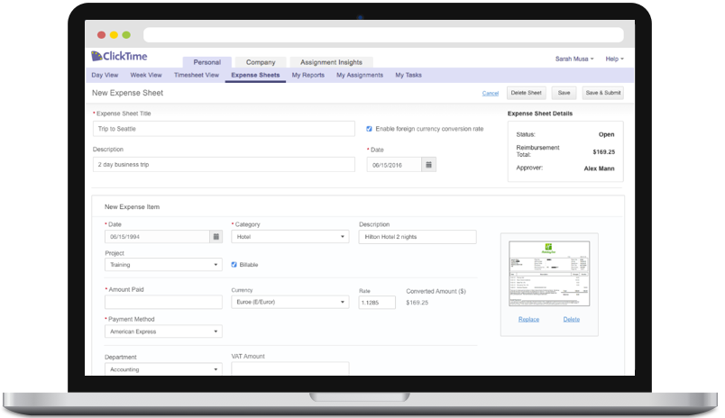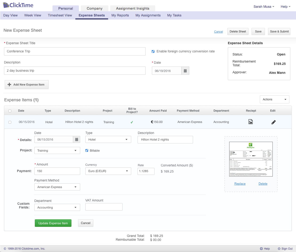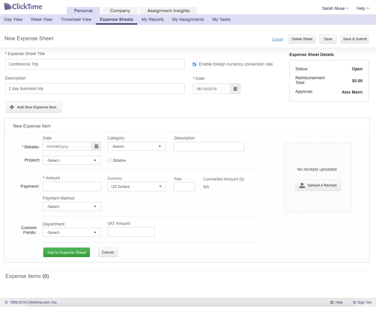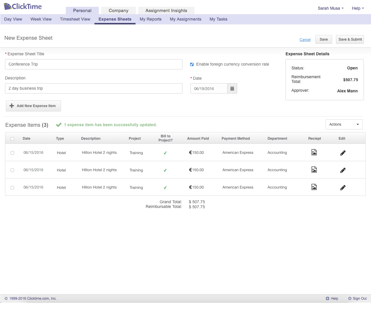 Keeping details about the expense sheet visible to the user during the creation of it, rather than hidden through an extra click, allows for accurate entry and minimizes errors they may make.